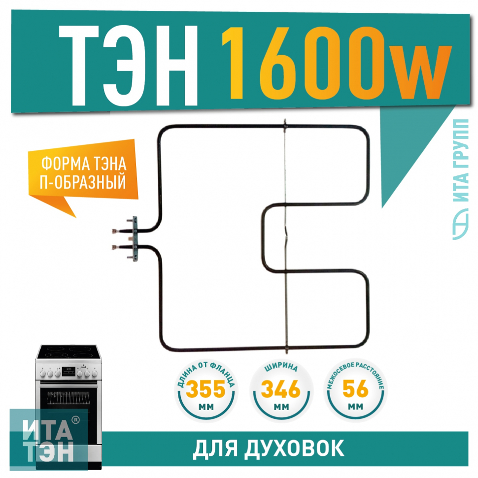 Мощность ТЭНа составляет 1600 Вт, что соответствует техническим требованиям совместимых с устройстов моделей духовок. Расстояние между отверстиями для крепления 56 мм.